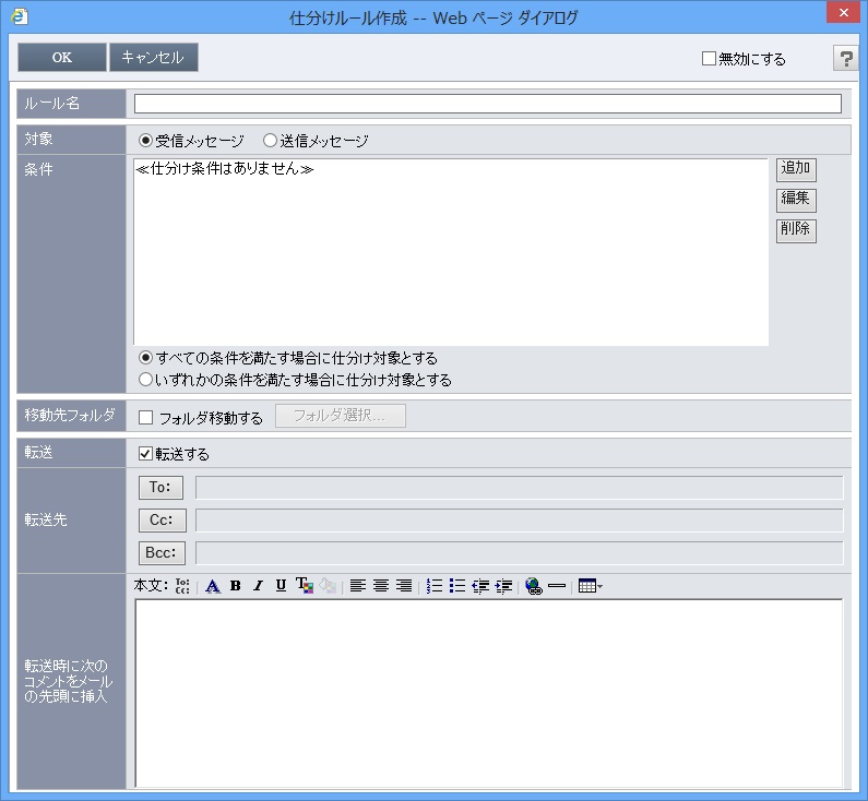 | 転送する | 転送する仕分けルールを設定する場合にチェックします。チェックした時、転送先とコメントが入力可能となります。 |