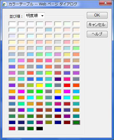 カラーテーブルから色を選択します。 色の並び順を「明度順」「色調順」「RGB順」「名前順」で切り替えることができます。 選択したい色をクリックすると枠囲い表示されます。その色で決定するには、 OK をクリックします。色の選択を中止したい場合は、キャンセルをクリックします。