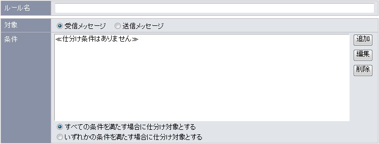 仕分けの対象を指定します。 受信メッセージ/送信メッセージから選択します。 ※送信メッセージを選択した場合、転送設定は入力不可となります。 |