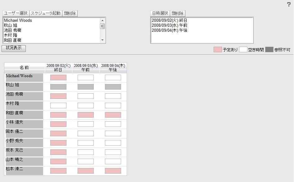 をもとにスケジュールの空き状況を一覧表示する画面です。
