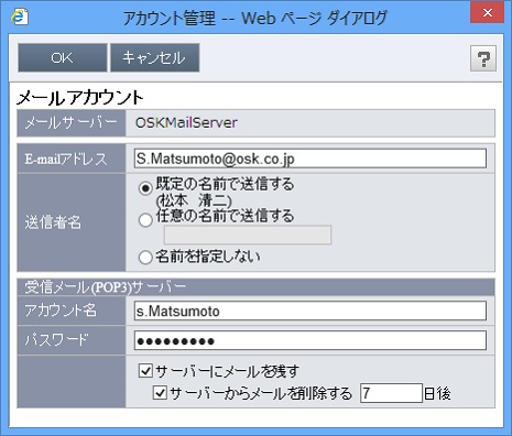 | アカウント名 | 受信メール(POP3)サーバーのアカウント名を入力します。 アカウント名は必須項目です。 |